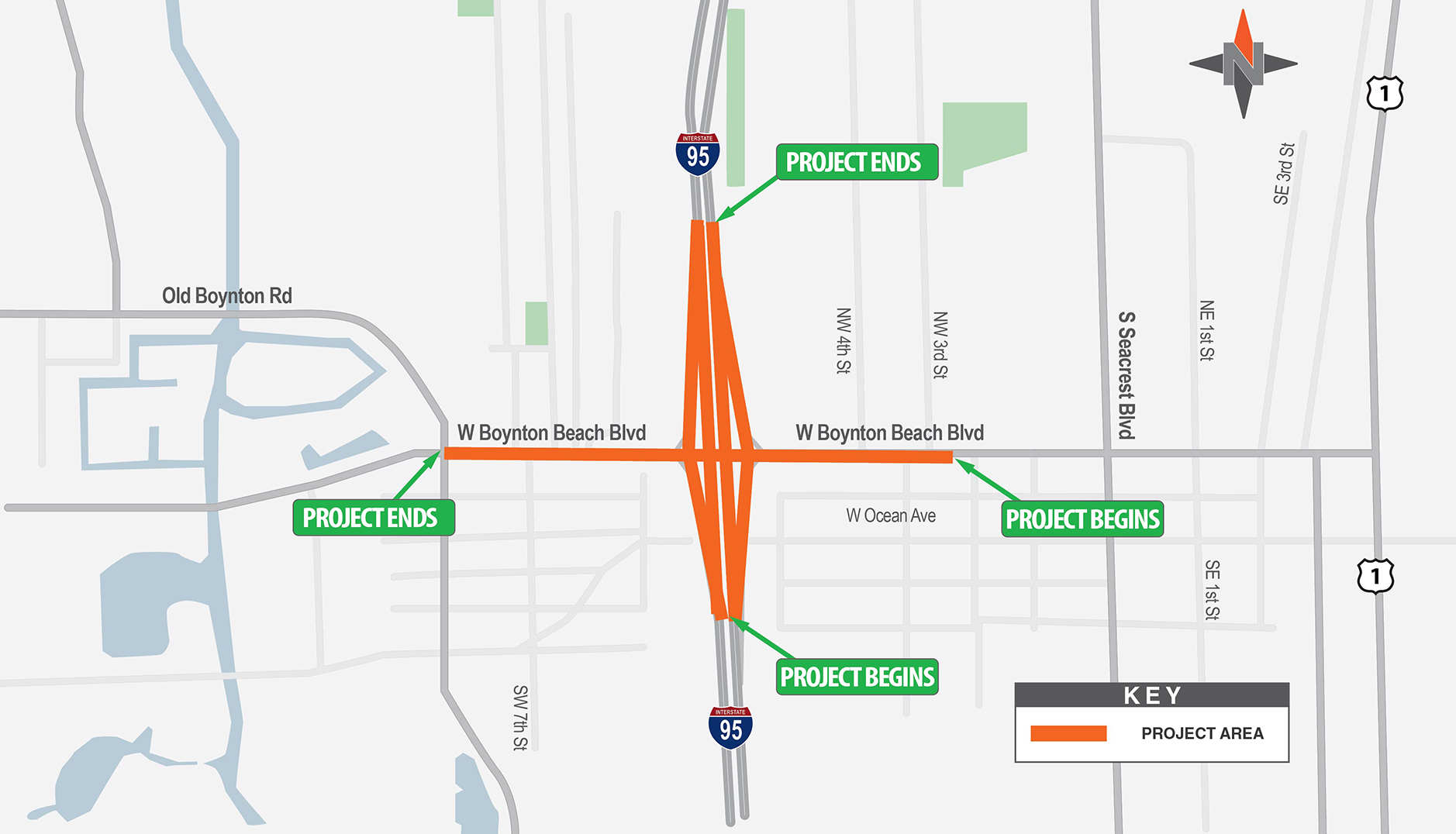 This design-bid-build project consists of widening, milling and resurfacing the existing SR-9 / I-95 at Boynton Beach Boulevard interchange (Exit 57). Work on I-95 will occur for the Boynton Beach Boulevard bridge widening and for each of the ramps; and work on SR-804 / Boynton Beach Boulevard will occur from Old Boynton Road / SW 8th Street to just east of NW 3rd Street. This interchange project proposes to enhance operational capacity, reduce congestion, and increase safety.